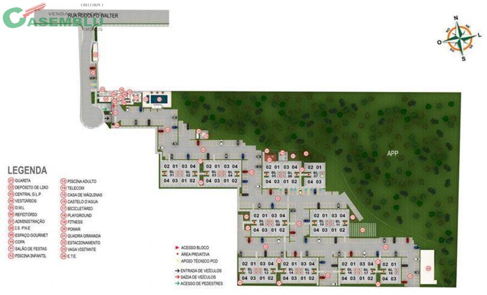 O Condomínio oferece: Área de Lazer completa, Torres de 04 andares, sendo 04 apartamentos por andar, Estrutura construtiva em concreto armado, Bicicletário com bicicletas compartilhadas, Playground, Academia ao ar livre, Piscina adulto e Infantil, Vestiários, Salão de festas, Espaço gourmet, Pomar em área arborizada, Quadra com grama sintética e Vagas para visitantes.